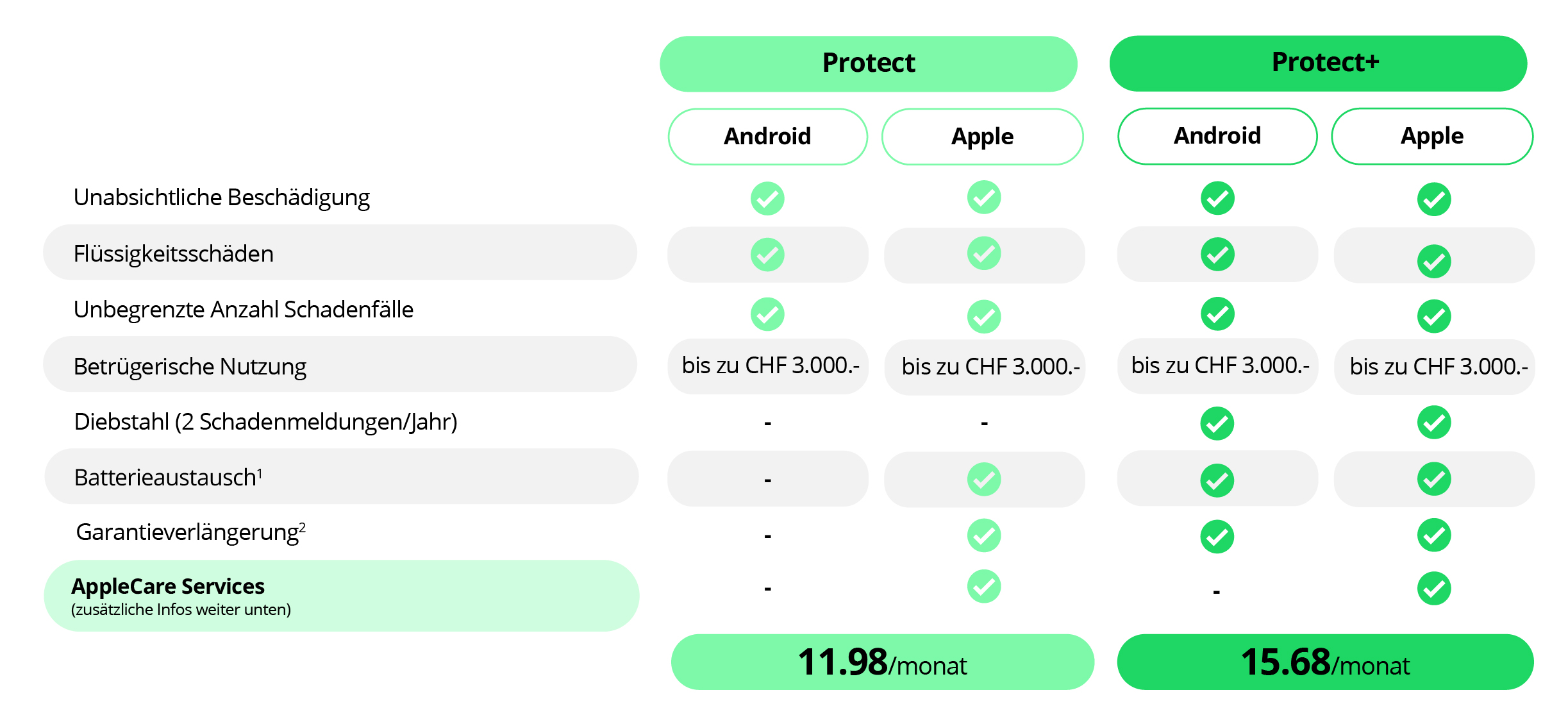 Die Protect- und Protect+-Abos haben eine Vertragslaufzeit von 24 Monaten. Du hast ein Widerrufsrecht innerhalb von 30 Tagen nach Aktivierung Deines Abos.