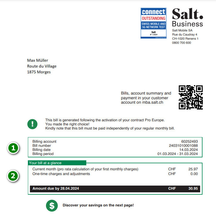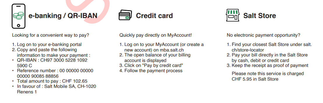 Depending on your payment method, you will find a dedicated section below. For more information on payment methods, please visit: www.salt.ch/buisness/payment