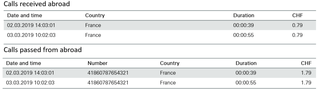 If you leave your voicemail box activated abroad, unanswered incoming calls which are redirected to your voicemail box will be charged if you are in a country which is not included in your price plan or if the call volume included in your price plan is already consumed. You will see the charges both in the section «Calls received abroad» and in «Calls from abroad», as incoming calls are reaching your mobile phone abroad and then are redirected to your voicemail box in Switzerland.