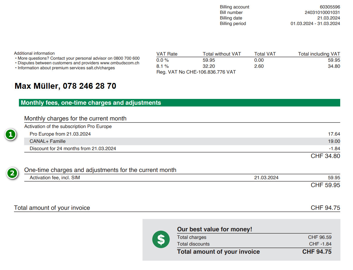 1. Monthly fee for the current month: : your costs for the month in which activation took place (incl. VAT): pro rata monthly subscription fee, additional services, discounts.