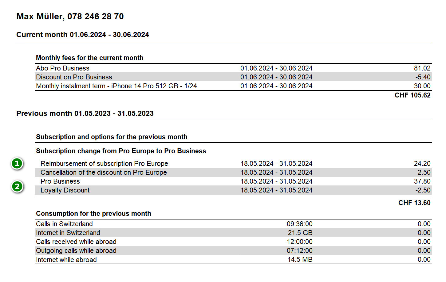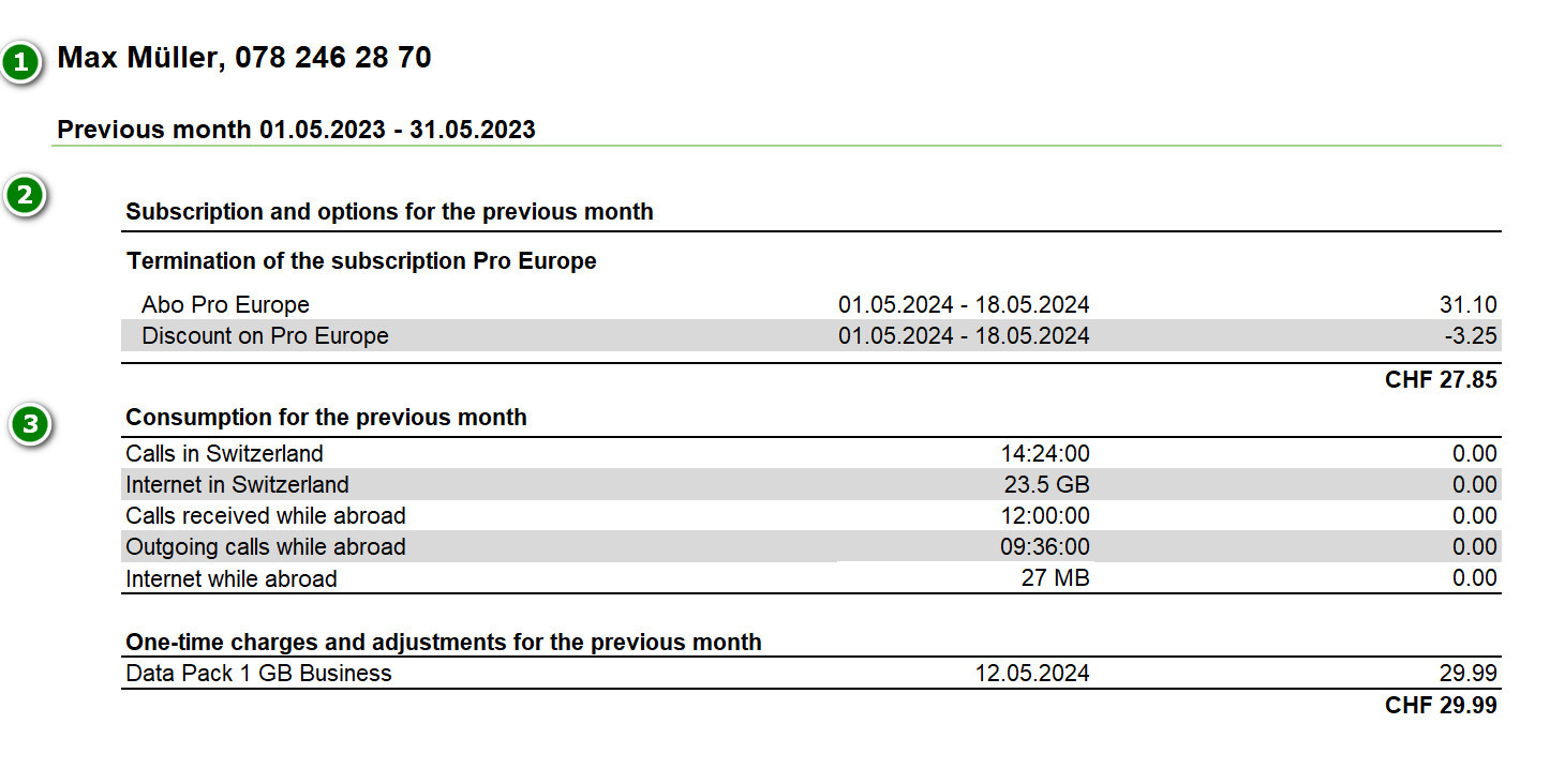 2. Subscription and options for the previous month : your costs for the month in which activation took place (incl. VAT): pro rata monthly subscription fee, additional services, discounts.