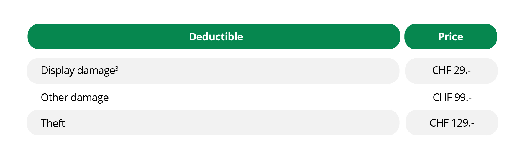 If both the display and the back cover are damaged, the deductible is applied twice (i.e., CHF 58.-)