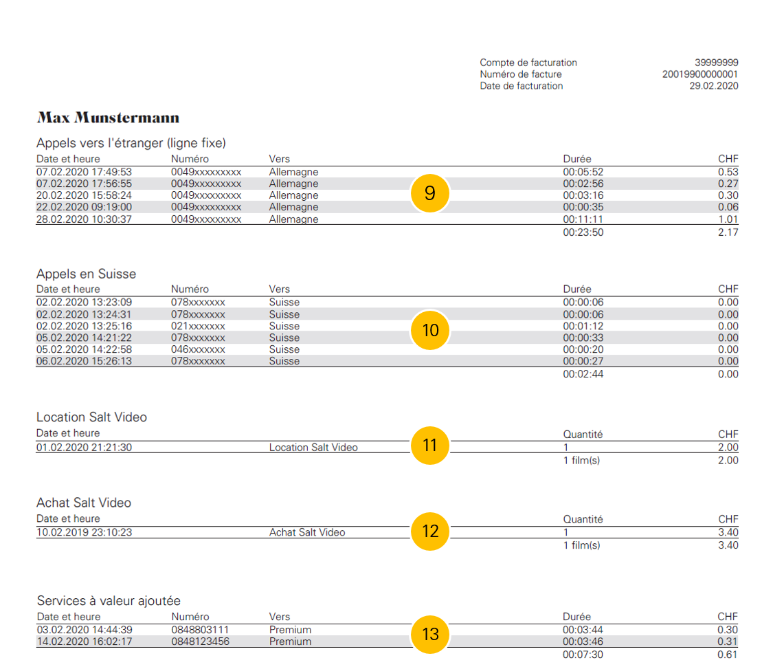7. Dans cette section, vous trouverez votre rabais pour les clients Mobile. Les clients Salt Mobile profitent d’un rabais mensuel de 10 CHF sur leur abonnement Fiber. Plus d’infos sur https://fiber.salt.ch/fr/help/fiber-support/get-started 8. Dans cette section, vous trouverez d’éventuelles charges et compensations ponctuelles. |