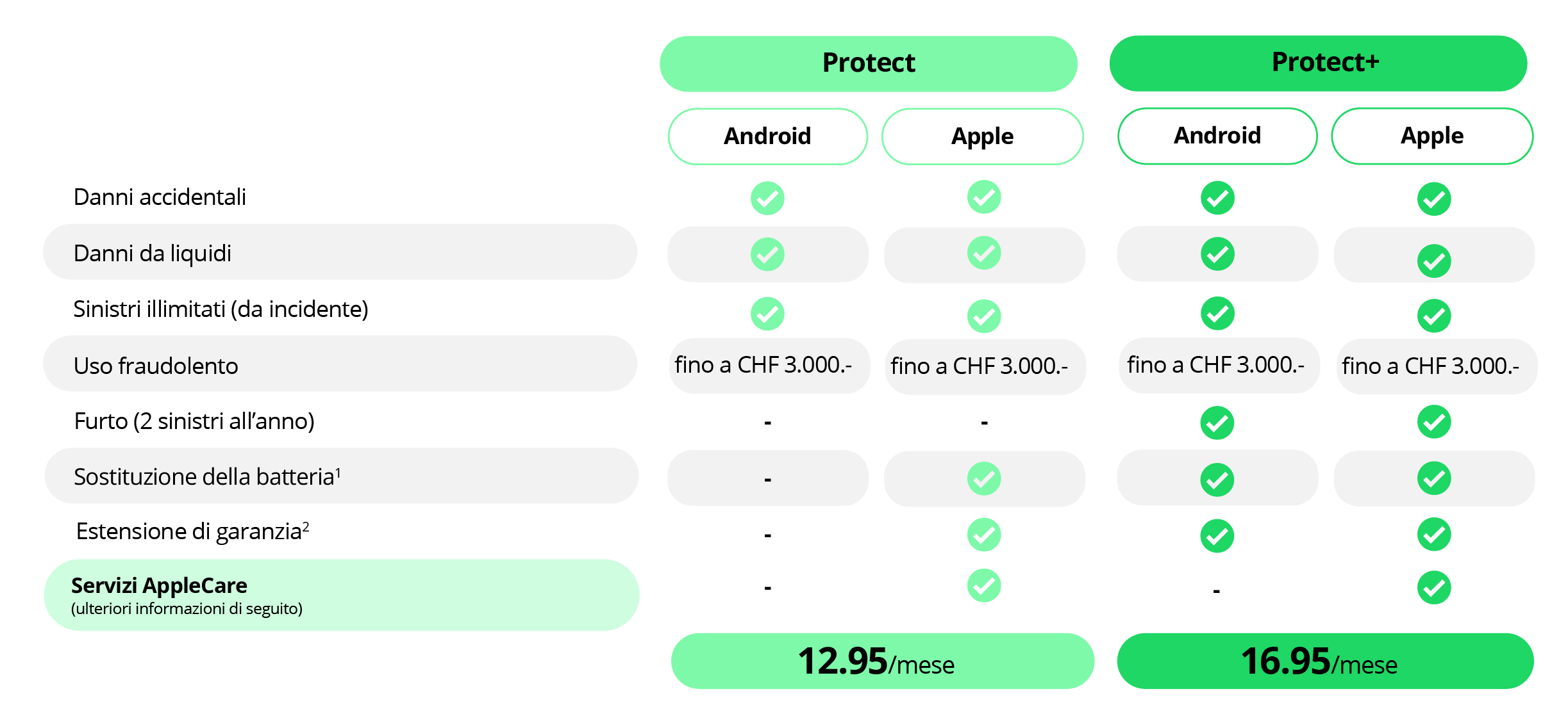 Protect e Protect+ sono polizze assicurative per dispositivi mobili con copertura in tutto il mondo, che forniscono assistenza rapida e affidabile in caso di sinistro. Sono disponibili quando ordini un nuovo dispositivo con un abbonamento Salt Mobile.