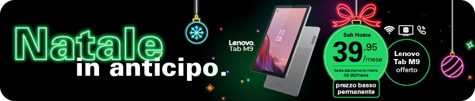 *Offerta valida per la sottoscrizione di un nuovo abbonamento Salt Home per 24 mesi in un Salt Store, online su salt.ch/home o per telefono allo 0800 780 800 entro il 08.01.2024. Prezzo mensile senza abbonamento di telefonia mobile e con Salt PrePay, Start Max, Swiss 10GB e Surf: CHF 49.95. Costi di attivazione: CHF 99.95. Prezzi senza abbonamento: Lenovo Tab M9 9’’ LTE CHF 159.-; Nokia Tab T10 LTE CHF 159.-.